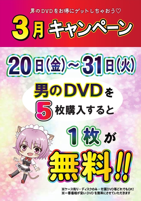 男のDVD5枚購入ごとに1枚無料!!